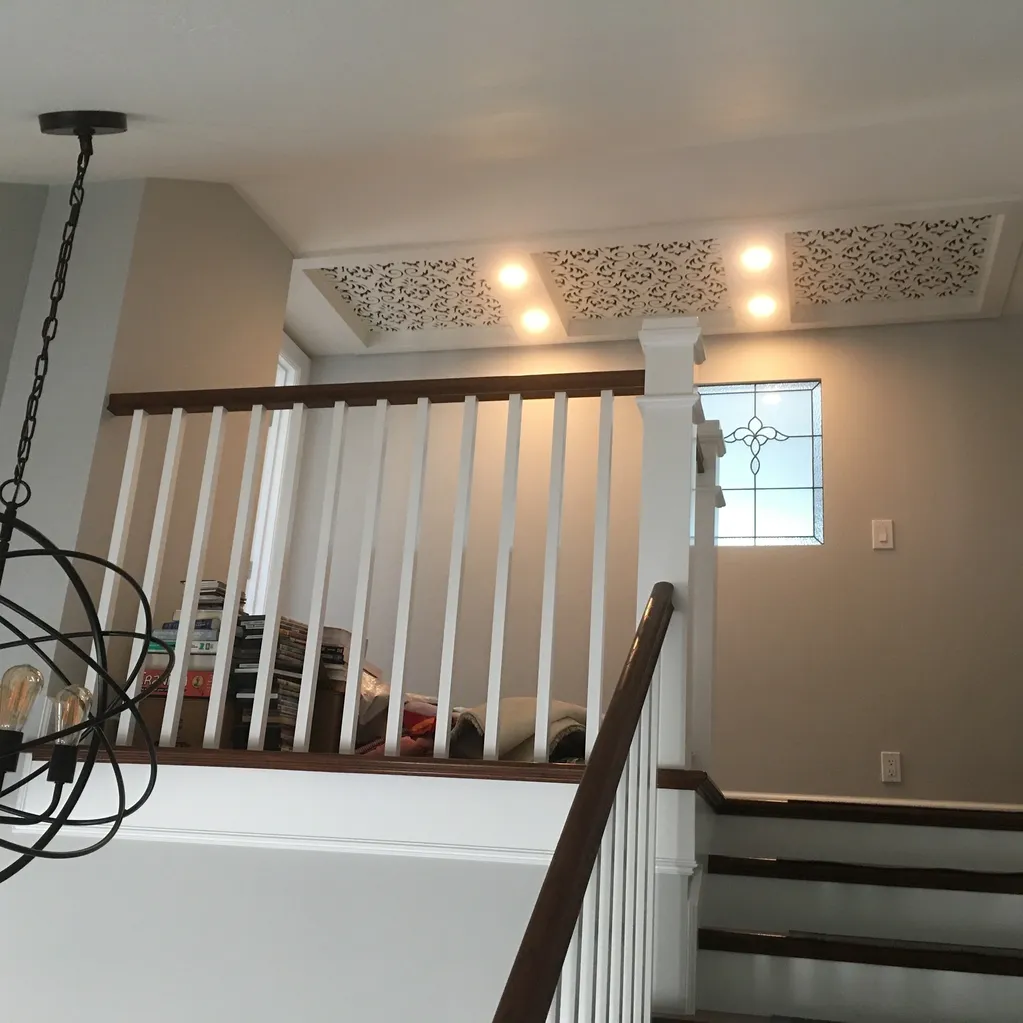 This is a one-piece ceiling insert that eliminated two unsightly attic access panels and one unsightly HVAC return register.  The customer chose the carved design out of 10 different suggestions offered.  Then a full-size mock-up was drawn to confirm.  This one-piece design has three removable carved panels.  The left panel is easily removed to service the HVAC system, the middle panel allows full airflow for the HVAC return air, and the right panel easily removes for attic access.  The built-in LED lighting is installed from above for a totally custom look, hiding the LED bezels”