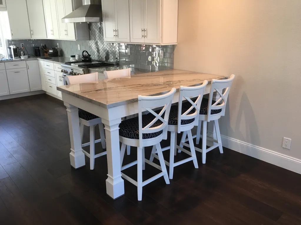 CUSTOM TABLE: Client required a custom granite-topped table that could be easily moved without damaging their luxury vinyl flooring. This was accomplished by dispersing the weight over 100 square inches of contact area with each leg being capped with an integral floor glide.