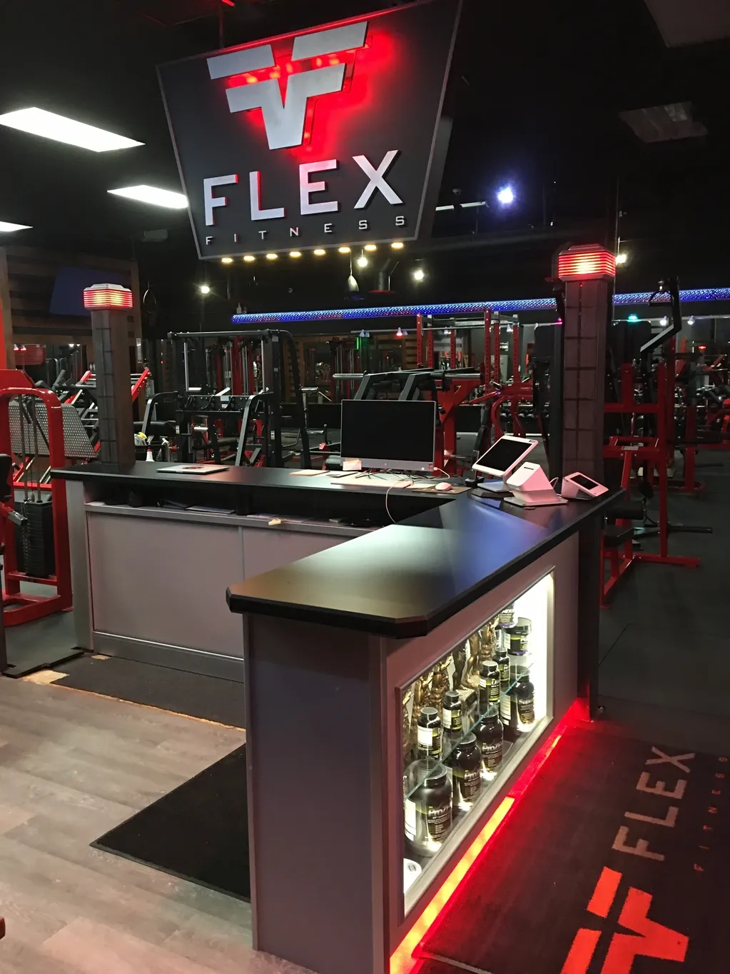 CUSTOM FRONT DESK AND LIGHTED HANGING SIGN: Desk needed to incorporate an integral display case and the two existing steel square tube pillars. We designed and added two lighted pillar caps, LED toe-kick lighting, lighted display case, and custom hanging sign using the clients existing logo and fonts.