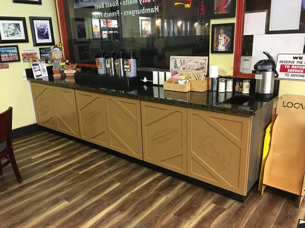 CUSTOM ONE-PIECE COMMERCIAL CABINET: Custom cabinet doors with the clients company logo engraved in two of the panels and a surfboard design engraved into four others.