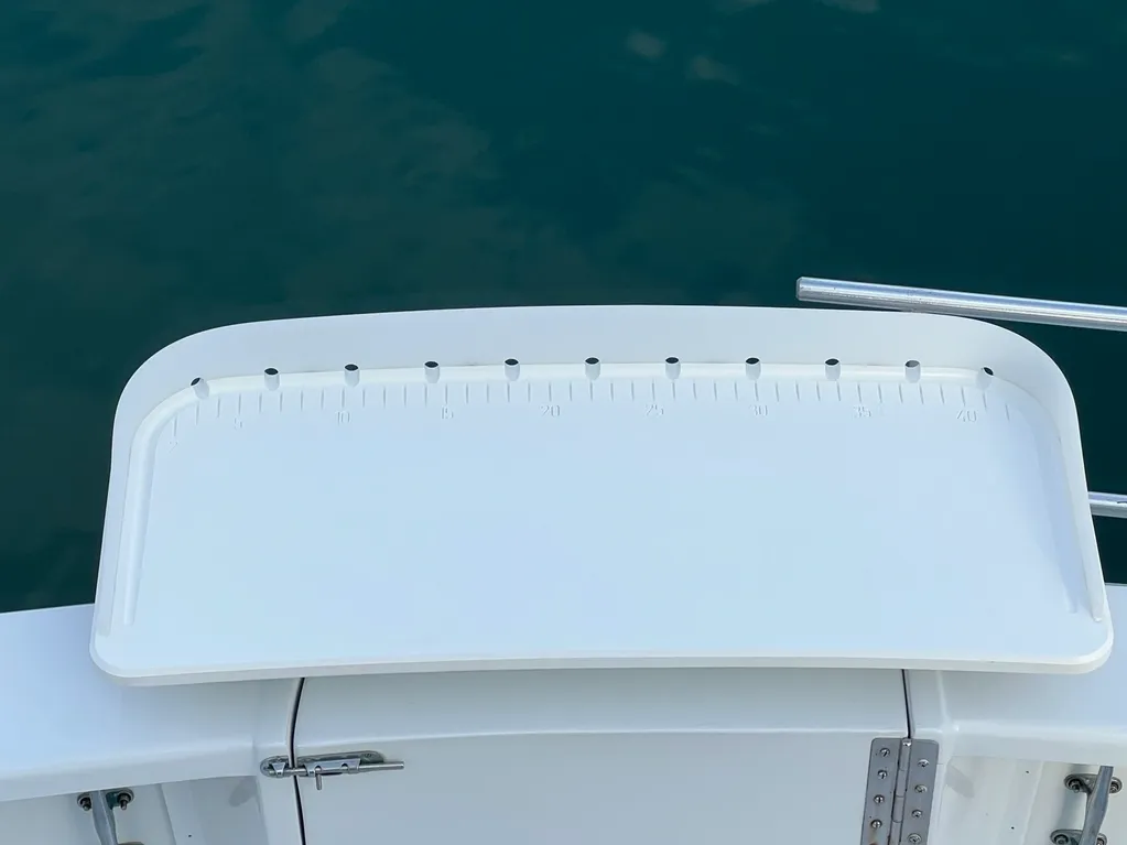 CUSTOM FILET BOARD: Using 1″ thick HDPE marine plastic for the base and 1/2″ thick LDPE marine plastic for the curved vertical backstop, this custom board was designed to exactly match the curved stern section of the client’s boat. The gutter, the inch measurement lines, and all the drainage ports are tapered towards the rear of the board which is itself mounted on two custom-made stainless steel brackets tilted 3 degrees towards the ocean.