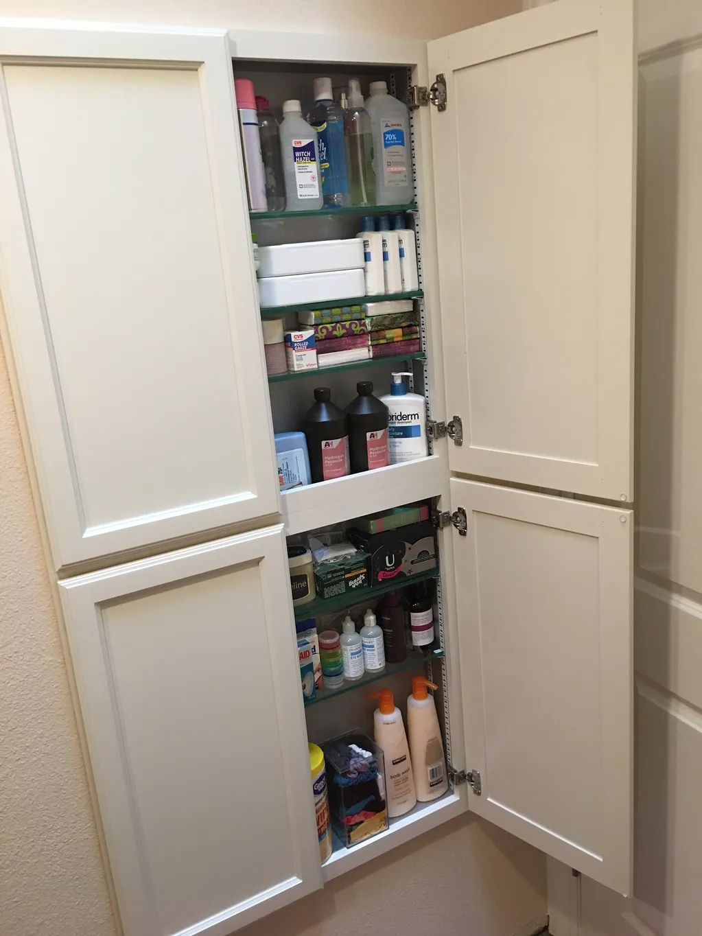 CUSTOM CABINET: A number of clients desired to use the spaces within stud cavities located in existing walls. We built many custom cabinets with each cabinet built to the exact dimensions of the space available to maximize storage space without encroaching into existing square footage.