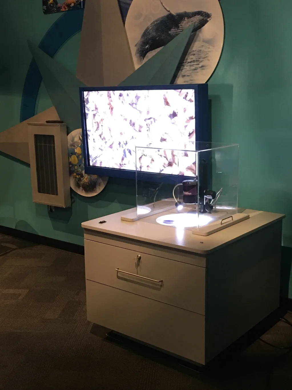 INTERACTIVE CABINETS: We designed and built two custom interactive cabinets for the Discovery Science Centers located in Orange County and Los Angeles. Each cabinet featured a remote controlled motorized rotating Petri dish platen, remote camera zoom, remote lighting control, and microscope access using remote controlled solenoid locking mechanisms.