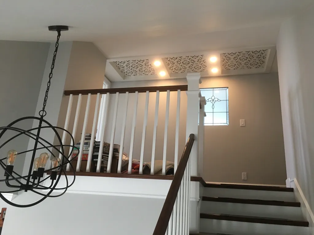 CUSTOM FABRICATED CEILING INLAY UNIT: Client needed two removable ceiling access panels and a HVAC return located in their upstairs hallway ceiling. We designed a custom, three-section, ceiling inlay unit, with integral LED lighting. The left panel removes for access to HVAC equipment, the right panel removes to allow attic access, the middle panel acts as the HVAC return grill.