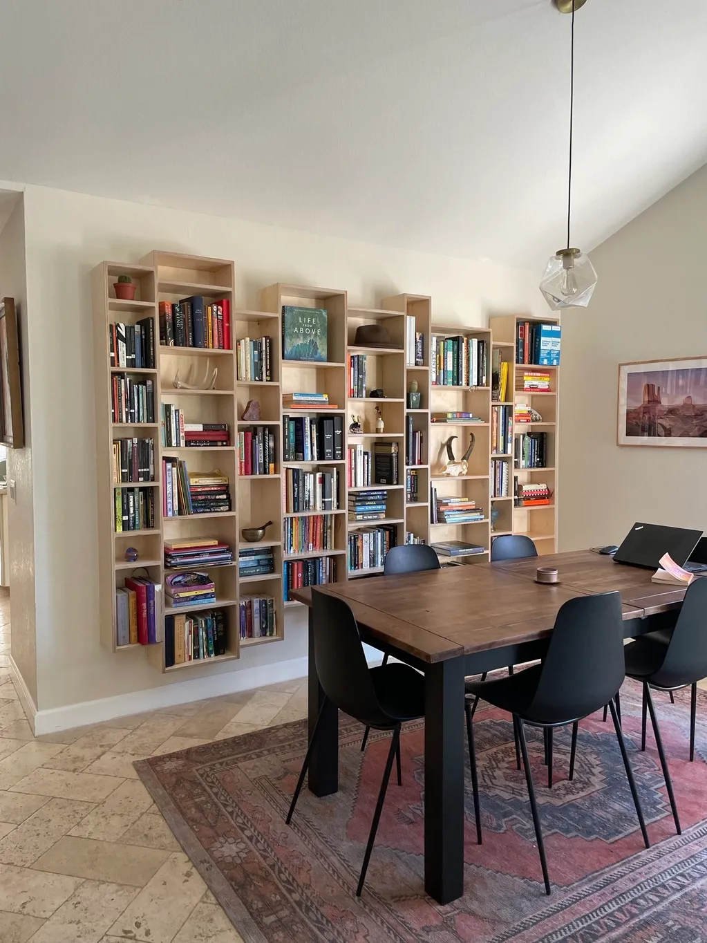 FLOATING BOOKCASE: Client wanted a custom floating bookcase. After the initial design was approved we built this bookcase out of Baltic birch plywood using only interlocking joinery. Except for the mounting hardware, no other metal fasteners were used.